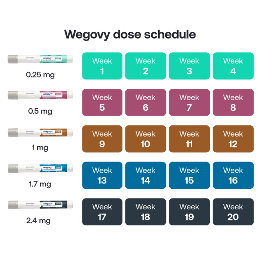 The different pens are color-coded, and you’ll usually move up to the next dose (and change pen color) every four weeks. The titration method of steadily increasing the amount of Wegovy gives your body time to adjust to semaglutide.